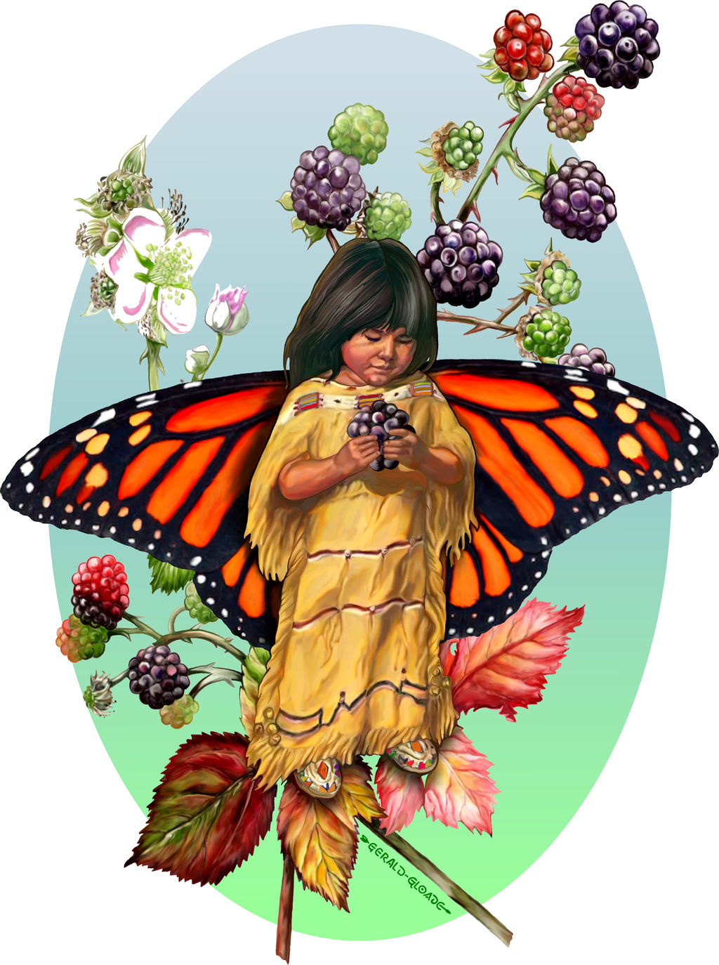 From the First Nation Community of Millbrook, near Truro, Nova Scotia. Gloade was raised by his grandmother, the late Viney “Brooks” Gloade. He spent more time with her, than with other children his own age, and had a precious opportunity to learn traditional and ecological knowledge and skills through her stories. His grandmother, imparted to Gerald, the ways of the land, the history of people and communities, the skills to fish and hunt, and the legends of Kluskap. It was those Stories and Legends of Kluskap that sparked the imagery captured in his Artwork.